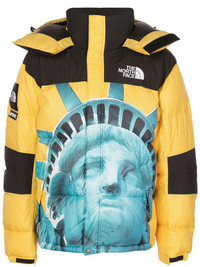 x The North Face Baltoro padded jacket Land of the free and home of this black and yellow goose down x The North Face Baltoro coat from Supreme. Oh say can you Supreme. Featuring a front zip fastening, long sleeves, side slit pockets, a padded interior, a graphic print and a hood. Imported Composition Outer: Nylon 100% Goose Down 85%, Duck Feathers 15% SIZE & FIT Model measurements Height 6 ft 2 in(1.88 m) Bust/Chest 38.18 in(97 cm) Hips 37 in(94 cm) Waist 29.92 in(76 cm) Washing instructions Machine Wash