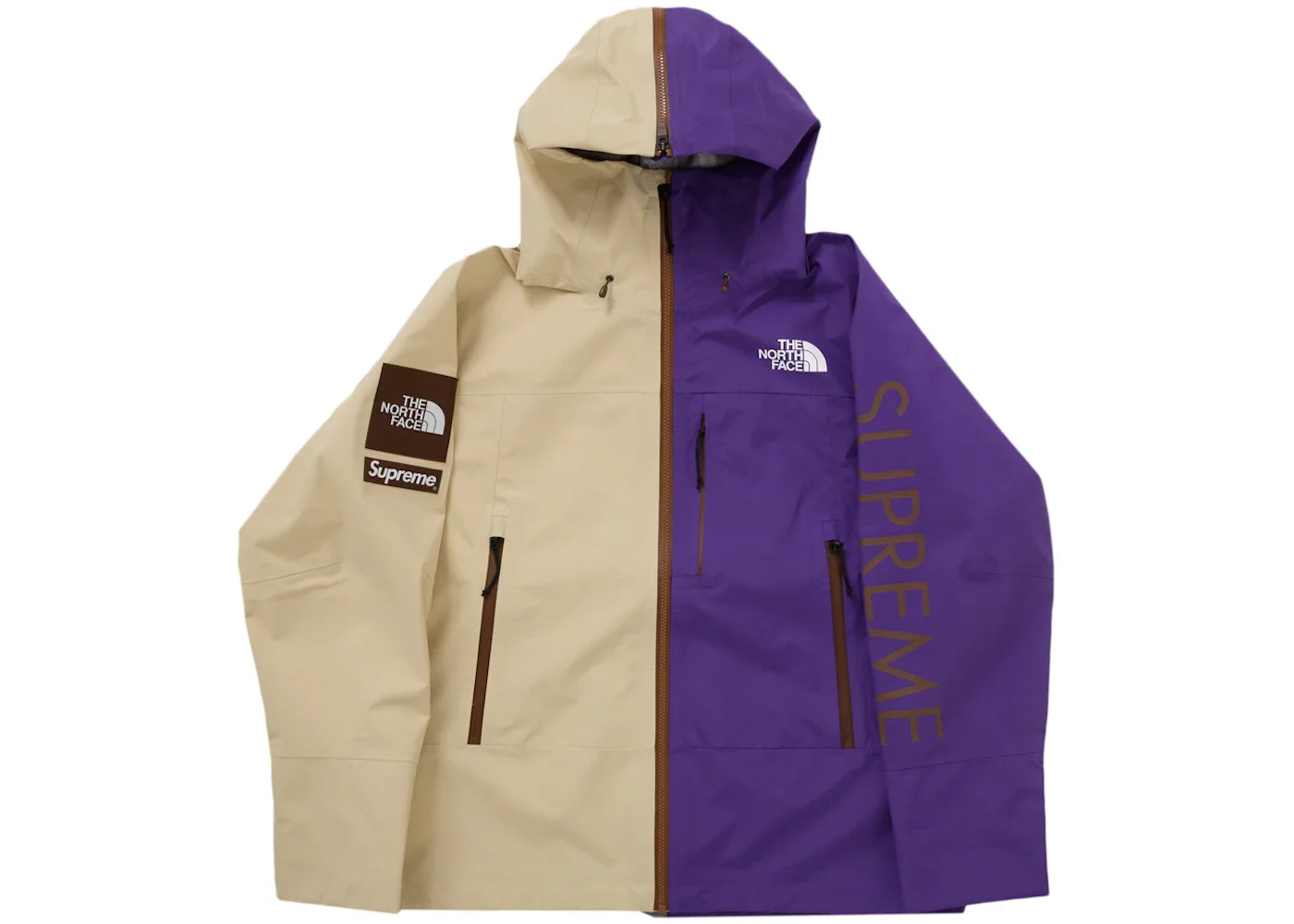 The Supreme The North Face Split Taped Seam Shell Jacket is a weather-resistant jacket designed as part of a team effort between Supreme and The North Face. This iteration of the Supreme The North Face Split Taped Seam Shell Jacket comes in a tan and purple colorway. The tan color appears to the left side of the zipper of this hooded jacket, while the purple color appears to the right. The tan arm sports black patches on the sleeve bearing The North Face and the Supreme logos in white text, while the purple side features The North Face logo in white on the chest and "SUPREME" running down the arm. The jacket has three pockets: one on each side and another on the chest. The back of the jacket also features The North Face logo in white on the tan side. What we like best about this jacket is the taped seam build, which allows for increased waterproofing. The Supreme The North Face Split Taped Seam Shell Jacket was released on February 29th, 2024, for a price of $398. - Season SS24 - Color Tan - Release Date 2024-02-29 - Retail Price 398 - Featured false - Requester Kelsey K - Uploaded By LL