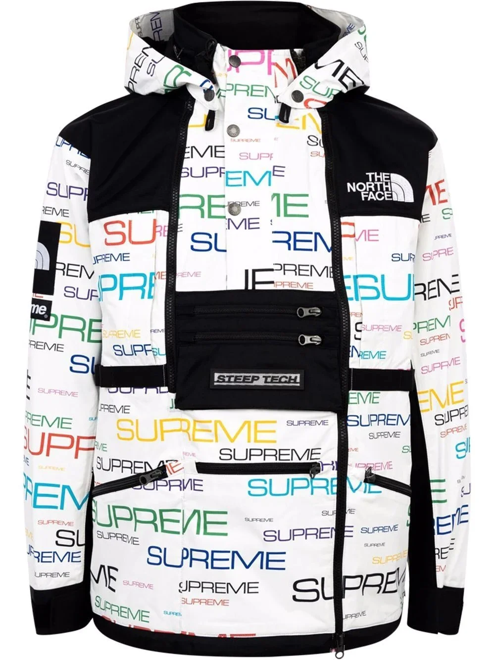 x The North Face Steep Tech Apogee jacket For this collaboration, Supreme and The North Face have returned to logomania. Part of the AW collection, this Tech Apogee jacket was built to protect from cold. It features waterproof construction and is decorated with multicoloured logos from front to back, top-to-bottom. Highlights - White - Embroidered logo to the front - Embroidered logo to the rear - All-over logo print - Detachable hood - Front button fastening - Front zip fastening - Front zip fastening pockets - Long sleeves - Straight hem - When buying this unisex item, keep in mind that it is graded in standard men's sizing Made in United States Composition Nylon 100%