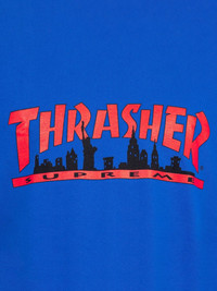 x Thrasher Skyline logo-print T-shirt Created in combination with Thrasher, this T-shirt from Supreme's FW21 collection pairs bold logo detailing from the two brands with a New York City skyline graphic, in reference to Supreme's home city. Made in United States Composition Cotton 100%