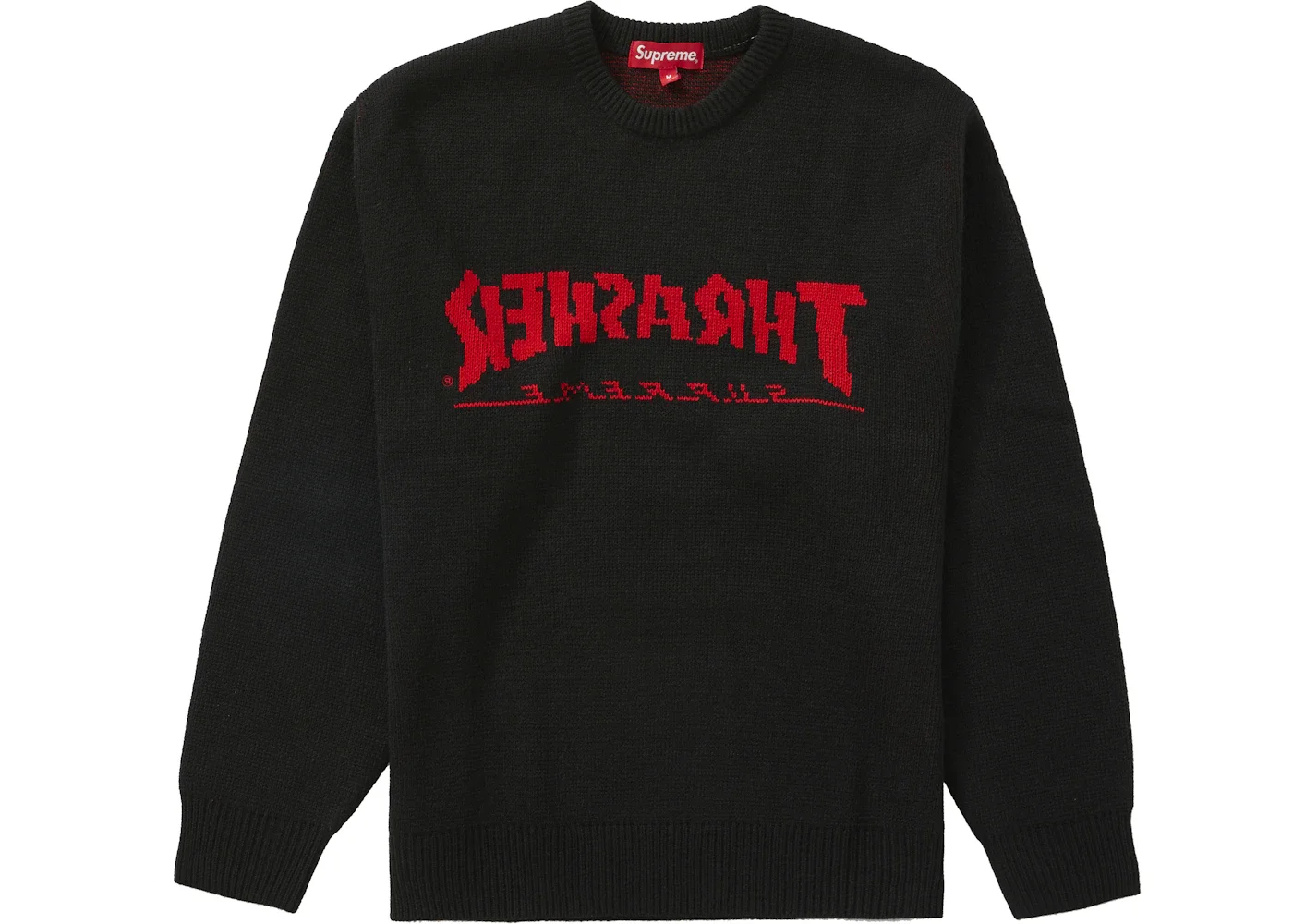 This black Supreme Thrasher Sweater was released during the Fall/Winter 2021 season in Week 5. Supreme's Fall/Winter 2021 Thrasher collaboration resulted in a more than 45 piece apparel collection that featured sweaters, t-shirts, hats, and more. This sweater features an inverted Supreme Thrasher logo on its chest. The Supreme Thrasher Sweater was made available in three different colors. The black Supreme Thrasher Sweater was released on September 23rd, 2021, at the retail price of $168. - Season FW21 - Color Black - Release Date 2021-09-23 - Retail Price 168 - Featured false