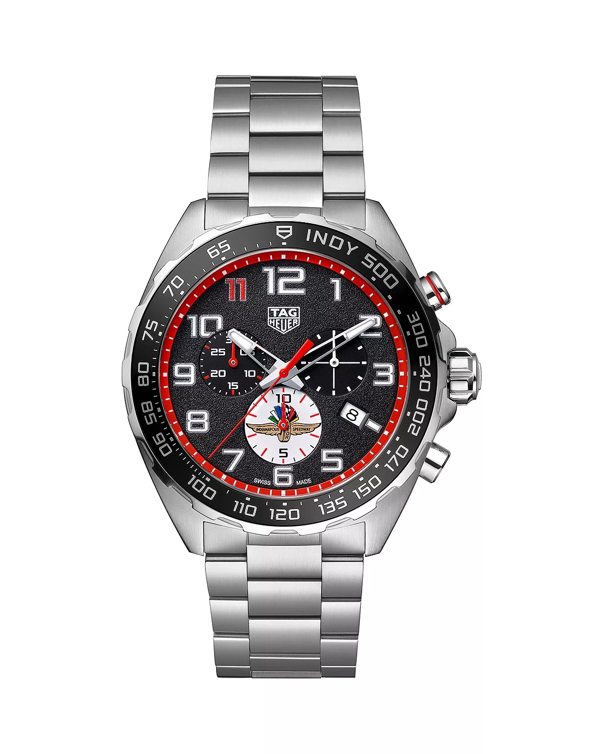 PRODUCT DETAILS - Stainless steel; sapphire crystal - Case size: 43mm - Folding clasp closure with push-buttons - Water resistant to 20 ATM - Swiss quartz chronograph movement - Black dial with date display at 4 o'clock - Three chronograph sub-dials & tachymeter bezel - Stainless steel link bracelet - Manufacturer's 2-year international warranty - Photo may have been enlarged and/or enhanced - Made in Switzerland Web ID: 5139904