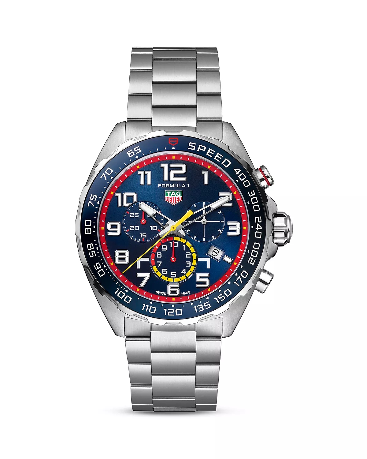 PRODUCT DETAILS - Stainless steel; sapphire crystal - Case size: 43mm - Fold-over clasp closure - Water resistant to 20 ATM - Quartz movement - Blue chronograph dial with day/date display at 4 o'clock - Tachymeter bezel & three sub-dials - Stainless steel bracelet - Manufacturer's 2-year limited warranty - Photo may have been enlarged and/or enhanced. - Made in Switzerland Web ID: 4314309
