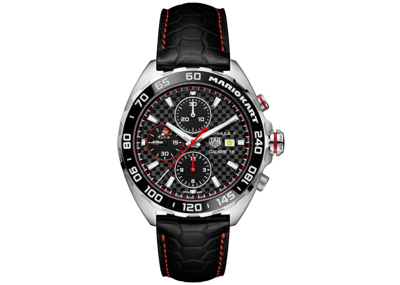- Reference Number CAZ201E.FC6517 - Case Size 44mm - Case Material Leather - Band Stainless Steel - Movement Automatic - Dial Black - Retail Price 4300 - Base Model Formula 1 x Mario Kart - Featured false - Styles Sport
