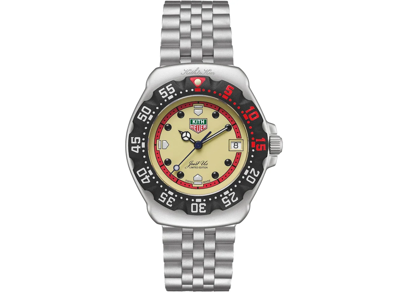 The TAG Heuer x Kith Formula 1 WA121F-BA0023 is the next generation of TAG Heuer stylish watches. Part of the Kith Formula 1 collection, it is both sporty and sophisticated. Some of its standout features include a beige-colored dial with red accents, an engraved logo on the back and front of the watch, and a glow-in-the-dark face that lets you read it better in the dark. Keeping with the elegance and luxury of the TAG Heuer name, this watch comes in a beautiful black box. This box also has the watch's name printed on it, along with the designer logo. Like many high-end watches, the TAG Heuer x Kith Formula 1 WA121F-BA0023 has a folding clasp with double safety buttons to help keep your watch secure. What our team most admires about this watch is its thick, five-link steel bracelet and its auto-racing-inspired color combination. This watch was released on May 6, 2024, for $1,500. - Reference Number WA121F-BA0023 - Case Size 35mm - Case Material Stainless Steel - Band Stainless Steel - Movement Quartz - Dial Eggshell - Retail Price 1500 - Base Model x Kith Formula 1 - Featured false - Requester Rachel M - Styles Sport - Uploaded By VL
