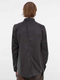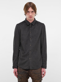 Gray shirt in beaver cashmere with spread collar, silver-tone metal buttons, and diagonal contrast topstitching at back. Featuring: • Relaxed fit • Spread collar • Front button placket closure • Silver-tone metal buttons • Raglan long sleeves • Diagonal contrast topstitching at back • Shirttail hem • Made in Japan • 99% Cashmere 1% Reflective Nylon • Numeric sizing Model is 6'1.5" wearing size 8. Shoulders: 18.5" Chest: 37" Waist: 31"