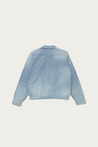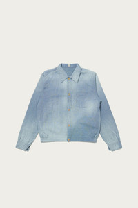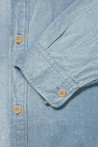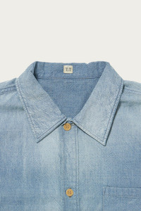 The Palaka Jacket was originally developed as workwear for Japanese immigrants in Hawaii during the early 1900s. Designed to be lightweight and perfect for the tropical climate, it features small shell buttons for a casual, breathable fit. The base fabric is a reproduction of 1910s American work jacket material, woven on old-style power looms with original indigo yarn and yellow-dyed American cotton. A degreasing washer finish is added for an aged, dry touch. The ozone bleached finish gives it a sun-faded look.