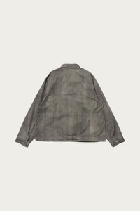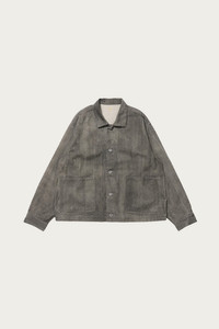The Lot.303 Coverall Jacket is rooted in history, tracing back to an unbranded American coverall from 1910 discovered in a coal mine. Taiga Takahashi reimagines it as both artifact and living garment, balancing archival reverence with contemporary craft. This season’s iteration comes in two distinct fabrications: a revived “TWEEDUROY,” a corduroy printed with a tweed pattern originally developed in Massachusetts for durability in boys’ uniforms, and a hand-painted sumi version inspired by Kyoto karakami marbling. Each piece is unique, the sumi ink brushstrokes applied by Yuzen artisans to create subtle shifts in shading that cannot be replicated. Hardware is true to form—iron buttons and back parts engraved and left uncoated so they patinate with age. What emerges is a jacket that feels like a century-old find but with materials and finishes designed for today.