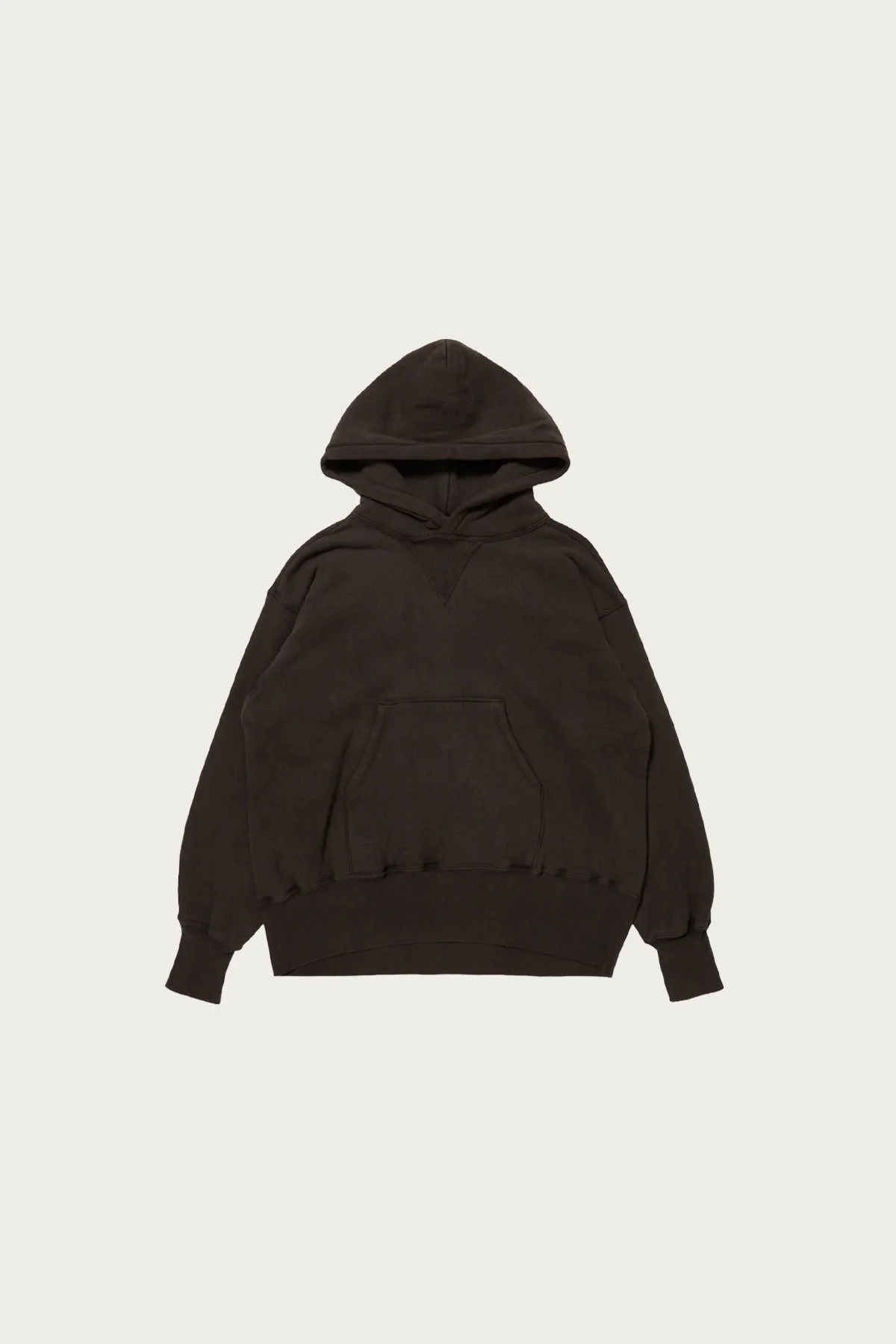 The Lot. 606 Hoodie reinterprets what the vintage clothing industry calls the “retrofit hoodie”, sweatshirts patched with hoods that became archetypal for everyday wear. T.T brings that historical background into a refined, modern form while preserving the spirit of early sportswear. This piece is cut from tubular jersey cotton, knit in Wakayama on the world’s last surviving hanging knitting machine from the Taisho era (1912–1926). Though capable of producing only about a meter of fabric per hour, the machine imparts a texture unlike any other: dry to the touch, subtly uneven, and airy, as if the surrounding atmosphere were woven into the cloth. Made from American cotton, the result is a fabric that feels alive, balancing comfort and character. The garment is finished in Mud Dyed Brown, using the traditional mud-dyeing technique of Amami Oshima Island. Each hoodie is dyed one by one, resulting in a completely unique shade and depth of color. No two are ever exactly alike. - 100% Cotton - Inspired by the “retrofit hoodie” of vintage sportswear - Tubular jersey knit on an antique Taisho-era hanging knitting machine in Wakayama - American cotton with a dry, textured handfeel - Individually mud-dyed in Amami Oshima, each piece one of a kind - Made in Japan - Mud Dyed Brown