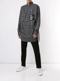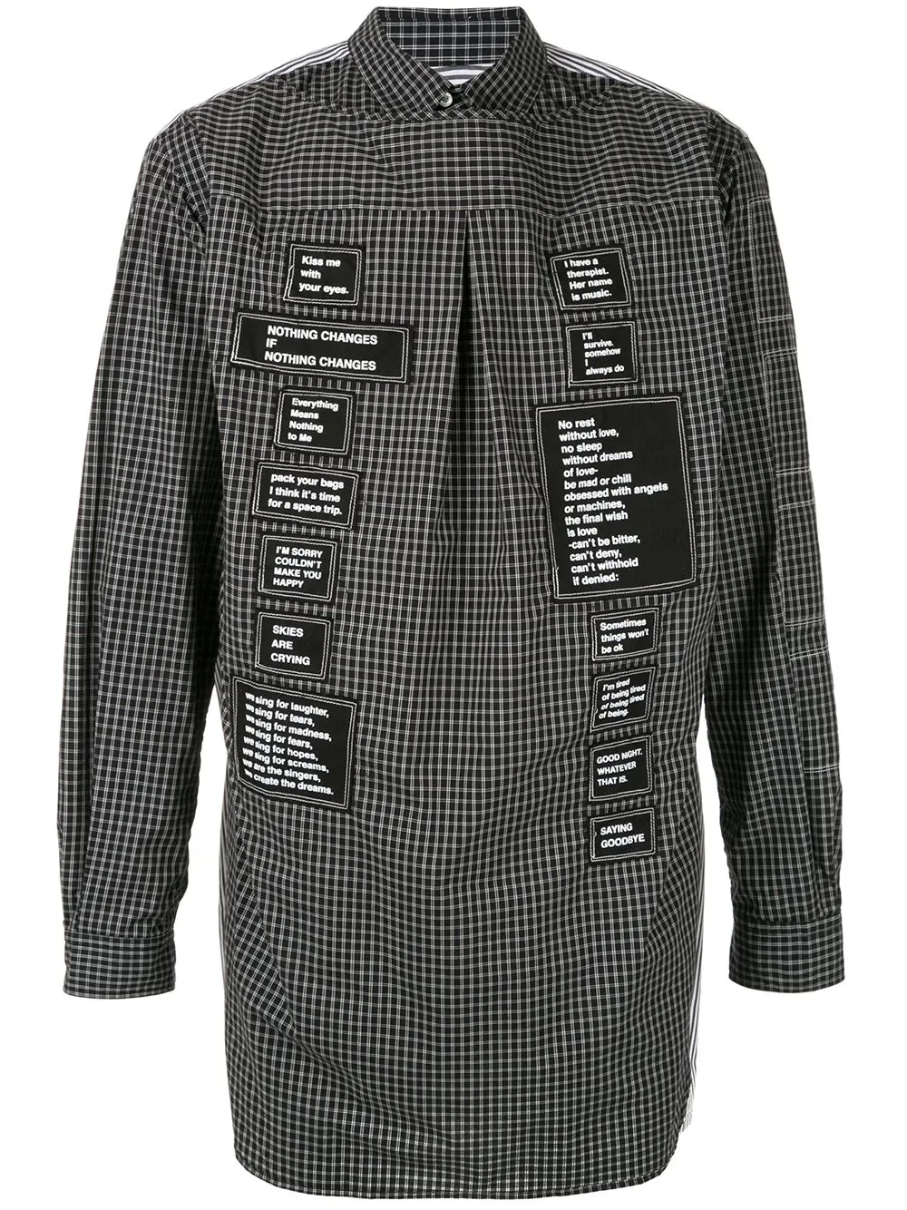 deconstructed patch logo shirt Black and white cotton deconstructed patch logo shirt from Takahiromiyashita The Soloist featuring a pointed collar, long sleeves, button cuffs and check and striped print details. Imported Composition Cotton 100% SIZE & FIT Model measurements Height 6 ft 2 in(1.88 m) Bust/Chest 38.18 in(97 cm) Hips 35.43 in(90 cm) Waist 29.92 in(76 cm) Washing instructions Dry Clean Only