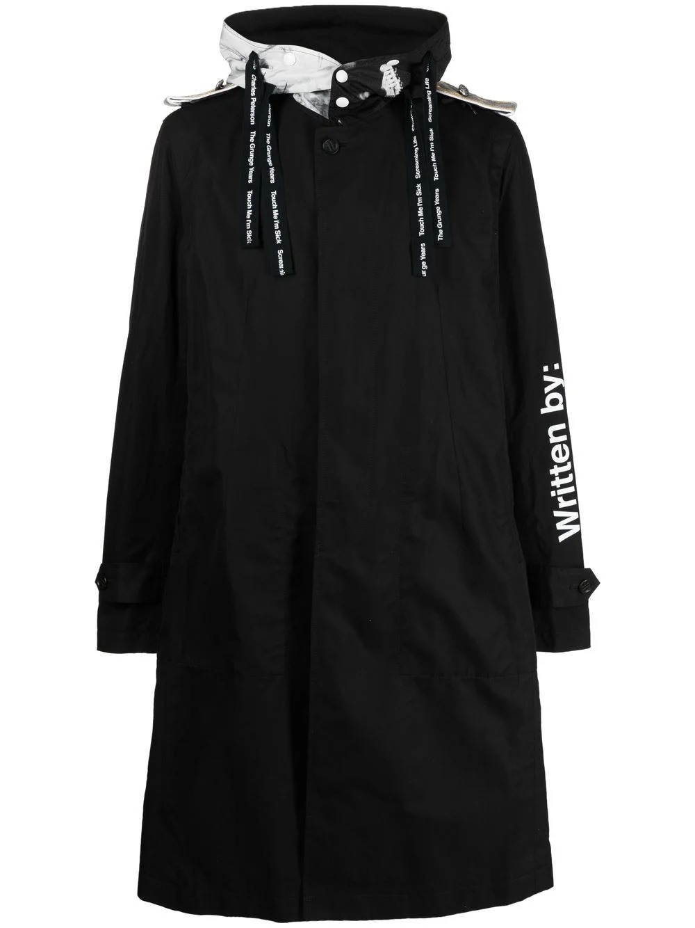 WRITTEN BY TWO-TONE PARKA COAT FROM TAKAHIROMIYASHITA THE SOLOIST FEATURING BLACK/WHITE, COTTON, TEXT PRINT, DRAWSTRING HOOD, CONCEALED FRONT FASTENING, LONG SLEEVES AND TWO SIDE WELT POCKETS.