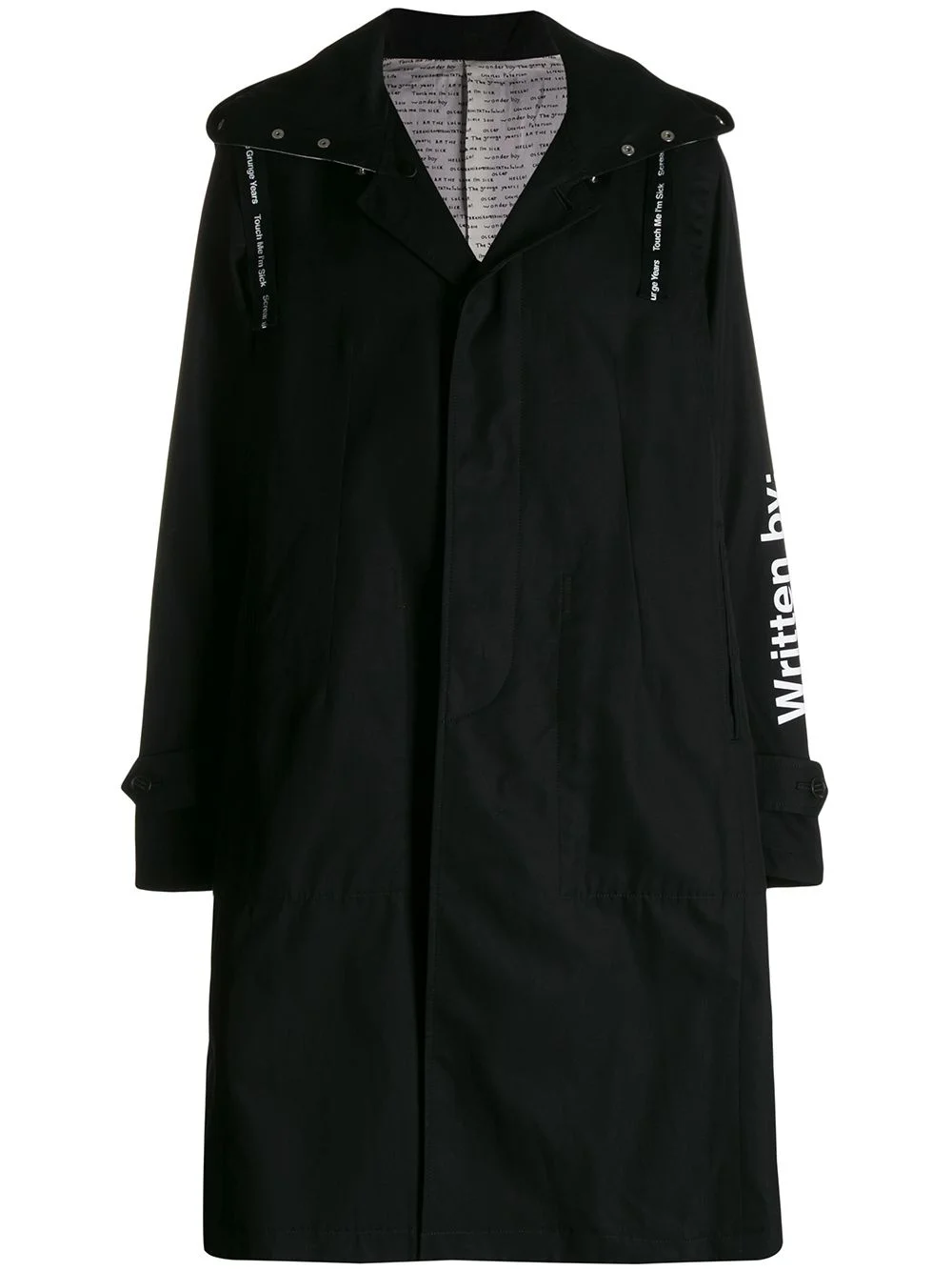 BLACK COTTON HOODED TRENCH COAT FROM TAKAHIROMIYASHITA THE SOLOIST FEATURING A DRAWSTRING HOOD, A FRONT BUTTON FASTENING, LONG SLEEVES, BUTTON TAB SLEEVES, A REAR CENTRAL VENT, A LONG LENGTH AND A STRAIGHT HEM.
