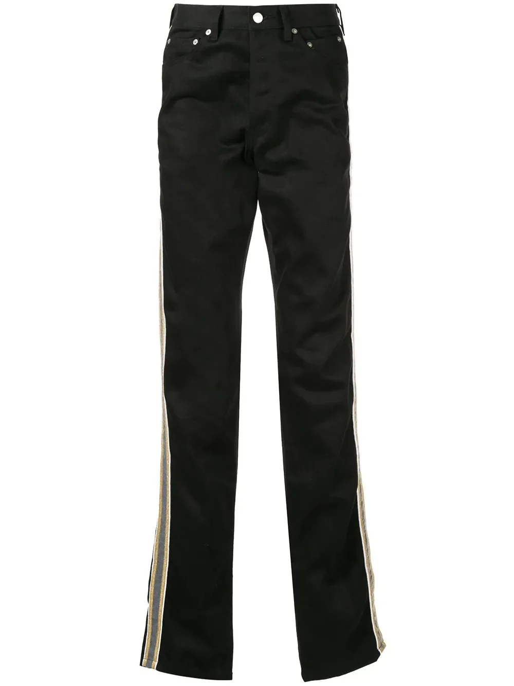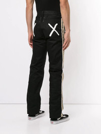 straight leg jeans Black cotton straight leg jeans from Takahiromiyashita The Soloist featuring a front button fastening, belt loops, a five pocket design, a stripe detail to the side, X painted details to the back pockets and a regular length. Imported Composition Cotton 100% SIZE & FIT Model measurements Height 6 ft 2 in(1.87 m) Bust/Chest 35.43 in(90 cm) Hips 35.43 in(90 cm) Waist 29.13 in(74 cm) Washing instructions Dry Clean Only