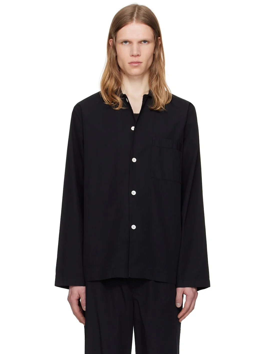 Lightweight organic cotton poplin pyjama shirt. · Certified OEKO-TEX Standard 100 · Stonewashed · Spread collar · Button closure · Patch pocket at chest · French seams at interior · Mother-of-pearl hardware Supplier color: All black 100% organic cotton. Made in Portugal 252482M218032