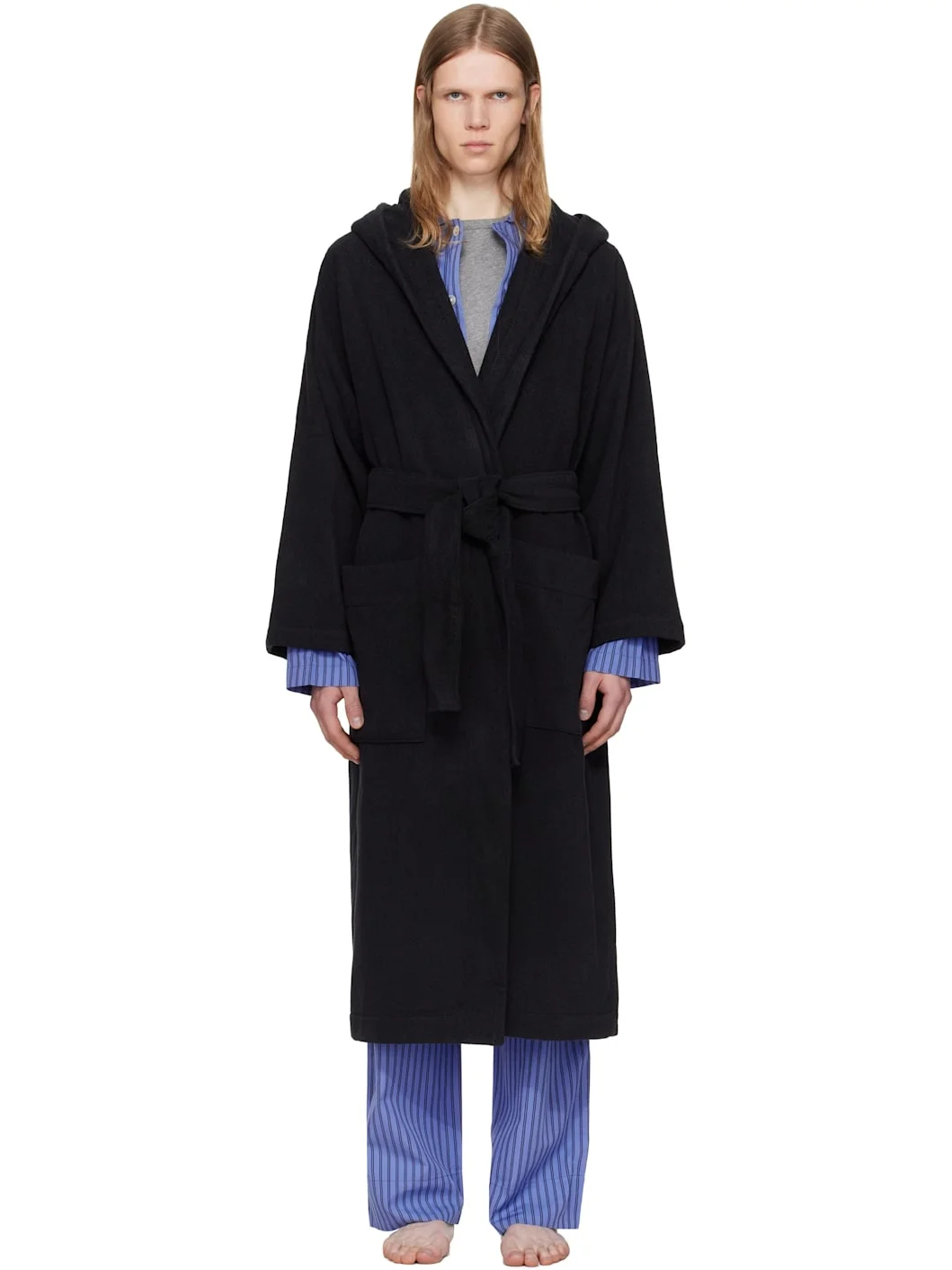 Heavyweight 385 gsm organic cotton terrycloth bathrobe. · Certified OEKO-TEX® Standard 100 · Hood at shawl collar · Open front · Belt loops and detachable self-tie belt · Patch pockets · Logo flag at side seam · Locker loop at inner collar Supplier color: Black 100% organic cotton. Made in Portugal 252482M219009