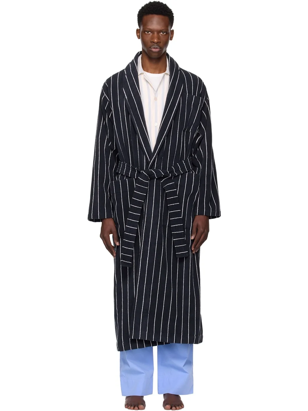 Heavyweight 385 gsm organic cotton French Terry bathrobe. Stripes throughout. · Certified OEKO-TEX® Standard 100 · Shawl collar · Open front · Patch pockets · Belt loops and detachable self-tie belt Supplier color: Antwerp 100% cotton. Made in Portugal 252482M219004