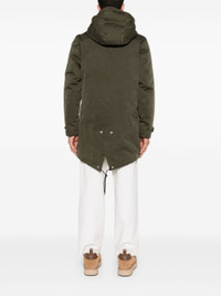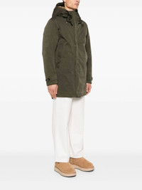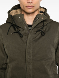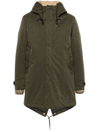olive green padded design coated finish drawstring hood front press-stud and zip fastening long sleeves with buttoned cuffs two side welt pockets central rear vent drawstring hem thigh-length partial lining Size & Fit Model Measurements: Height: 1.85 m Bust/Chest: 91.0 cm Hips: 95.0 cm Waist: 72.0 cm Model wears size 50 Fabric and Care Designer Style ID: 20CTCUK03091A02105 Designer Colour: 686 GREEN Composition: Outer: Polyamide 40%, Polyester 60%; Lining: Cotton 100%, Polyamide 100% Washing instructions: Machine Wash Made in Italy