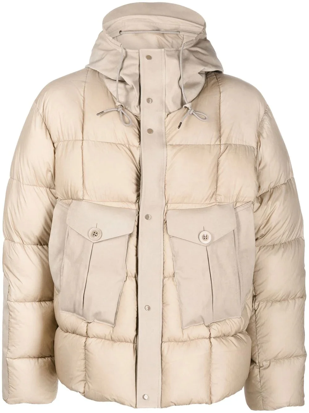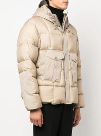 hooded padded jacket pale taupe cotton down-feather filling padded design panelled design silver-tone hardware drawstring hood front press-stud and zip fastening long sleeves straight hem two front patch pockets Imported Composition Lining: Polyamide 100%, Cotton 100% Duck Feathers 100% Outer: Polyamide 100% SIZE & FIT Model measurements Height 6 ft 2 in(1.87 m) Bust/Chest 36.41 in(92.5 cm) Hips 35.43 in(90 cm) Waist 29.52 in(75 cm) FittingInformation This piece fits true to size. We recommend you get your regular size Cut for a loose fit Made with a mid-weight non-stretch fabric Washing instructions Dry Clean Only