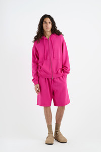 THE DAILY GROUP IS FOCUSED ON PIECES THAT CAN BE WORN EVERY DAY, YEAR-ROUND, AND ARE EASY TO CARE FOR. MADE IN LOS ANGELES, THE DAILY ZIP HOODIE IS MADE OF A COTTON AND CASHMERE BLEND WITH A SOFT VINTAGE HAND-FEEL. - BRIGHT PINK COTTON AND CASHMERE - RELAXED CROPPED FIT - TWISTED CASHMERE DRAWCORD - 2-WAY ZIPPER - RIBBED AT CUFF AND HEM - 2 FRONT POCKETS - MADE IN LOS ANGELES, CALIFORNIA - MODEL IS WEARING A SIZE MEDIUM SIZE GUIDE MATERIAL & CARE - 96% COTTON, 4% CASHMERE - THE ELDER STATESMAN'S - COTTON-CASHMERE DAILY CARE - WE RECOMMEND MACHINE WASHING IN COLD WATER WITH SIMILAR COLORS OR IDENTICAL COLORS ONLY, THEN TUMBLE DRY ON A LOW SETTING. IRON ON LOW-TEMPERATURE OR DRY CLEAN. - PLEASE DO NOT BLEACH - FRAYING MAY OCCUR DUE TO THE NATURE OF THE YARN. PLEASE USE CLOTHING SHAVERS THAT ARE DESIGNED FOR COTTON AND CASHMERE. - TO STORE OUT-OF-SEASON GARMENTS, USE ANY GARMENT STORAGE TO AVOID DUST AND PESTS - AVOID DIRECT SUNLIGHT TO PRESERVE THE COLOR SIZE & FIT - MODEL IS 6’3” WITH A 25.5” WAIST WEARING A SIZE MEDIUM - BODY LENGTH 24“ - ACROSS SHOULDER 22“ - CHEST 23“ - SLEEVE LENGTH 24 1/2“