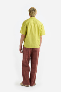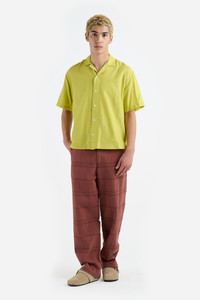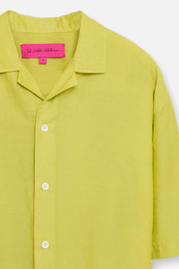 THE JAQUARD SILK CAMP SHIRT IS WOVEN WITH COTTON AND SILK FOR AN AIRY AND WEIGHTLESS GARMENT. THE PATTERN IS INTRICATELY WOVEN ON A JACQUARD LOOM AND SLIGHTLY TEXTURED TO THE TOUCH. - CHARTREUSE COTTON AND SILK BLEND - RELAXED AND SLIGHTLY CROPPED - CAMP COLLAR - 6 BUTTON CLOSURE - SLIT ON SIDE SEAMS - FRONT LEFT CHEST POCKET - LOS ANGELES, CALIFORNIA - MODEL IS WEARING A SIZE MEDIUM SIZE GUIDE MATERIAL & CARE - 70% COTTON, 30% SILK - THE ELDER STATESMAN'S - WOVEN TEXTILE CARE - WE RECOMMEND DRY CLEAN ONLY - PILLING MAY OCCUR DUE TO THE NATURE OF THE YARN. PLEASE USE CLOTHING SHAVERS THAT ARE DESIGNED FOR CASHMERE PILLING - TO AVOID EXCESS PILLING DO NOT PULL ANY PILLS ON THE GARMENT AND DO NOT TRY TO MANUALLY CLEAN A STAIN - STORE YOUR GARMENT IN A DRY, TEMPERATURE-CONTROLLED SPACE - TO STORE OUT-OF-SEASON GARMENTS, USE ANY CASHMERE GARMENT STORAGE TO AVOID DUST AND PESTS - AVOID DIRECT SUNLIGHT TO PRESERVE THE COLOR SIZE & FIT - MODEL IS 6’3” WITH A 25.5” WAIST WEARING A SIZE MEDIUM - BODY LENGTH 27“ - ACROSS SHOULDER 20“ - CHEST 23 1/2“ - SLEEVE LENGTH 10 1/4“