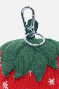 Strawberry-shaped cashmere patchwork keychain charm with metal lobster clasp. Details - 100% cashmere - 7 x 5 inches - Made in US