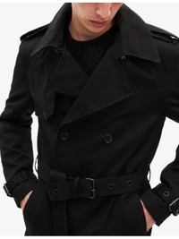 PRODUCT DETAILS - The Kooples cotton trench - 100% cotton - Exposed button fastening at front - Regular fit, lapel collar, buttoned pocket at chest, long sleeves, belted waist, double-breasted design - Dry clean - Model is 6ft 2in/1.88m and wears a size medium - Midweight, non-stretch Ref: R04519665