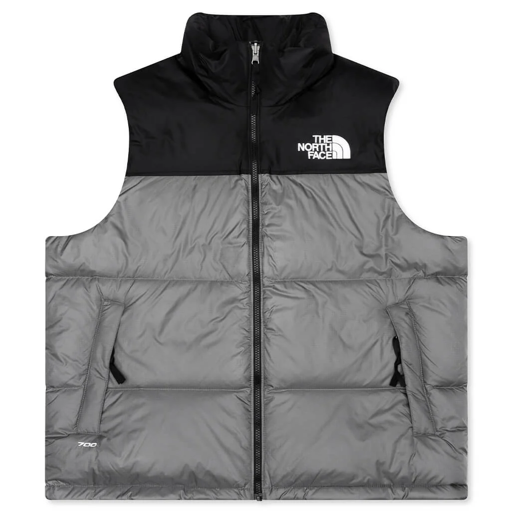 The 1996 Retro Nuptse Vest in 'Smoked Pearl' from The North Face features a relaxed, boxy fit with an adjustable hem shock cord. Made from recycled materials, it offers down insulation for warmth, ripstop fabric for durability, and water repellency properties. Key details include a packable three-piece hood, secure-zip hand pockets, and the ability to stow the jacket in the right hand pocket. - 100% recycled body, lining and overlay fabrics - Relaxed fit, hip-length silhouette / Interior hem shock cord - 700-fill down insulation - Ripstop fabric with solid taffeta blocking for abrasion resistance - Non-PFC DWR finish for water repellency - Attached three-piece hood packs into collar - Style No: NF0A3JQQRPI1