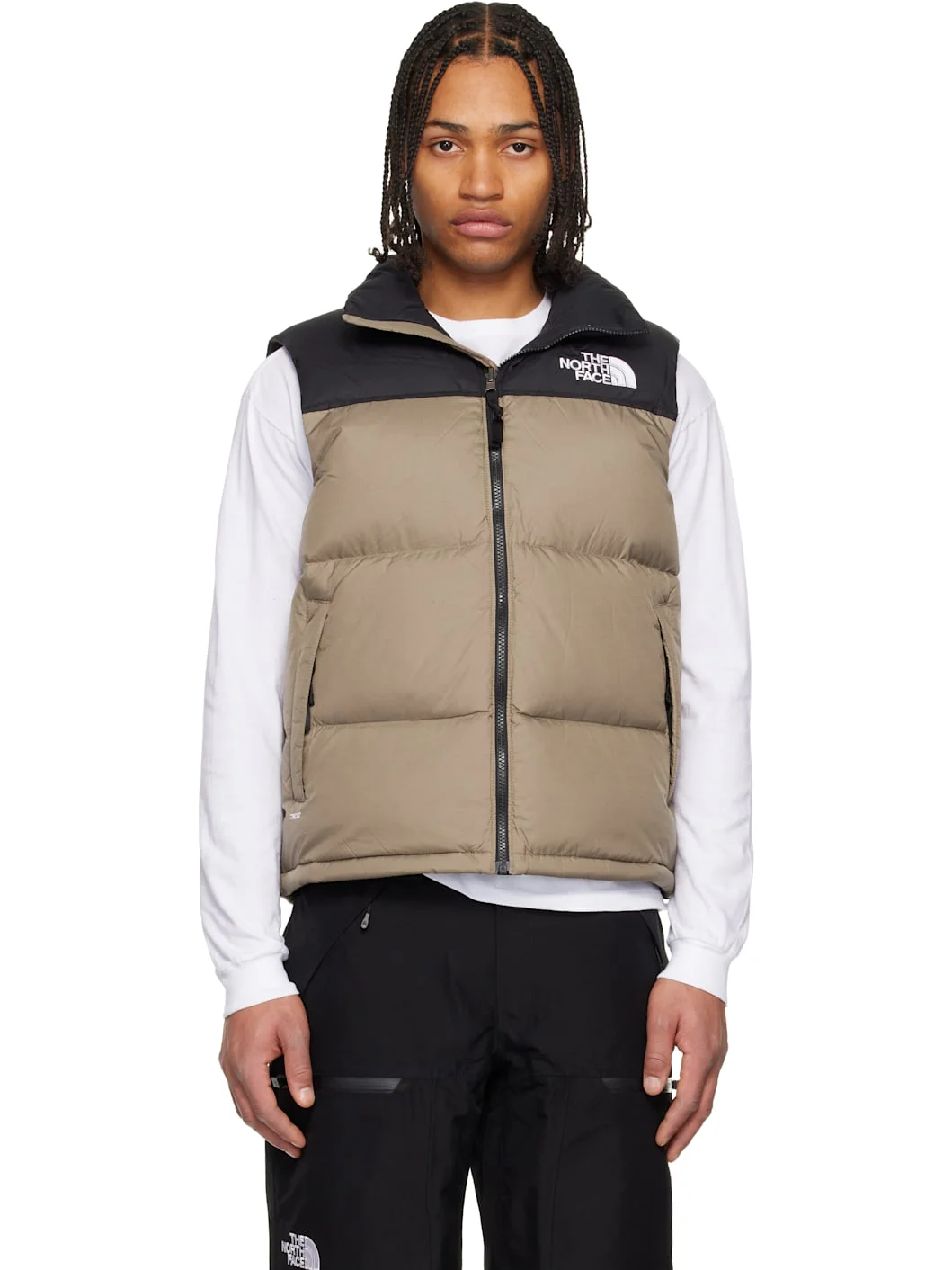Packable down-filled and quilted recycled nylon ripstop vest. · Water-repellent, non-PFC DWR coating · Recycled down · Stowaway hood at funnel neck · Bungee-style drawstring at hood · Zip closure · Logo embroidered at chest and back · Zip pockets at front · Concealed bungee-style drawstring at hem · Zip pocket at interior · Full taffeta lining Supplier color: Mocha brown/TNF black Body: 100% nylon. Fill: 80% recycled down, 20% recycled waterfowl feathers. Lining: 100% nylon. Made in Bangladesh 252802M178019