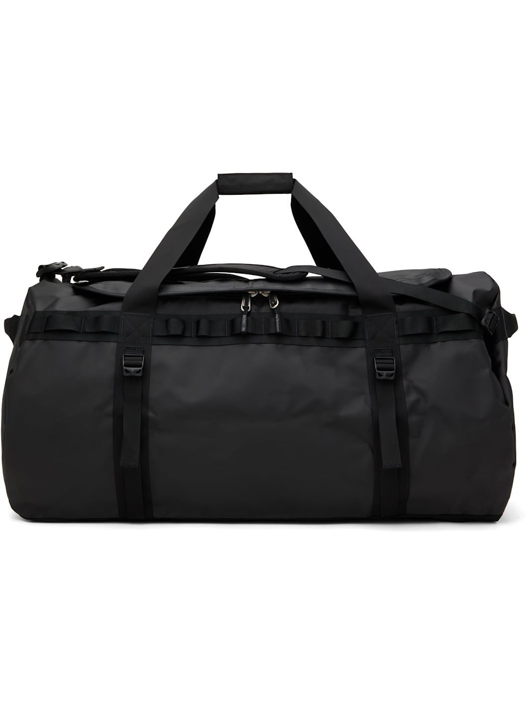 Vinyl-coated recycled polyester canvas and non-PFC DWR-coated recycled ballistic nylon canvas duffle bag in black. · Water-resistant and tear-resistant · Carry handle at sides · Velcro tab at shoulder straps · Adjustable and detachable padded shoulder straps · ID card slot at top · Webbing daisy chain at face and back face · Cinch straps at face and back face · Logo printed at sides · Zip pocket at side · Two-way zip closure · Mesh zip pocket at interior · Includes stowaway bag · H18" x W30" x D18" / 132 L Supplier color: TNF Black/TNF White Textile. Made in Cambodia 251802M169005