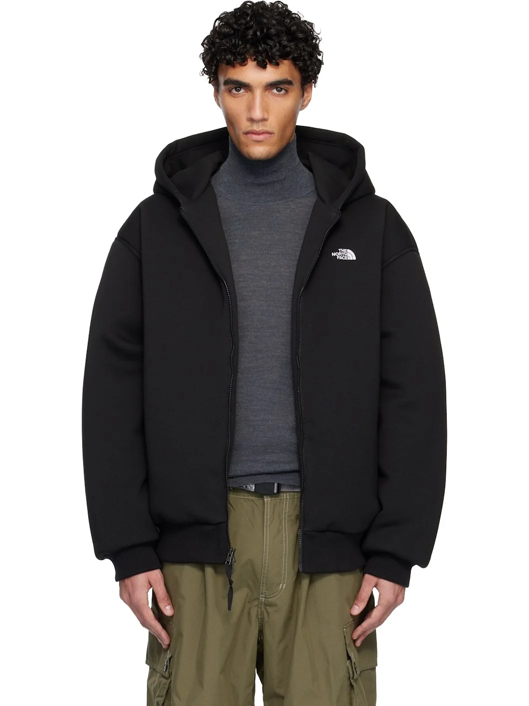 Heavyweight insulated bonded jersey jacket. · Water repellent, Non-PFC DWR coating · HEATSEEKER™ insulation · Insulated hood · Two-way zip closure · Logo embroidered at chest · Seam pockets at waist · Rib-knit hem and cuffs · Dropped shoulders · Zip pocket at Interior · Down-filled sleeves · Twill lining · Logo-engraved gunmetal-tone hardware Part of the limited edition Leather Pack capsule. Supplier color: TNF Black Body: 94% polyester, 6% elastane. Trim: 98% polyester, 2% elastane. Lining 1: 100% nylon. Lining 2: 100% polyester. Fill 1: 100% polyester. Fill 2: 75% down, 25% waterfowl feather. Made in Viet Nam 252802M180045
