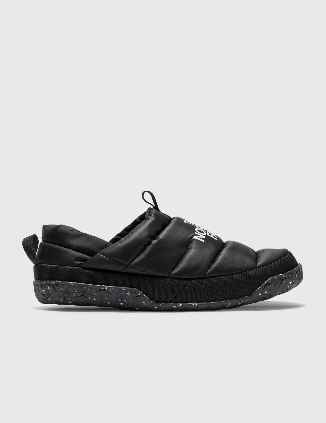 - The North Face - Nuptse Mule - Recycled PET upper - Insulated with 550 fill goose down - Foldable heel design - Durable rubber outsole made with 40% recycled rubber - Color: Black - Material: 100% PET - See more Sandals and Shoes