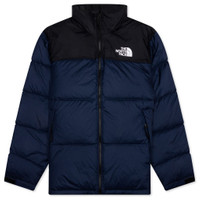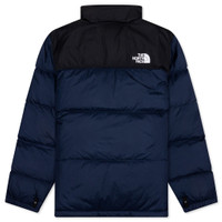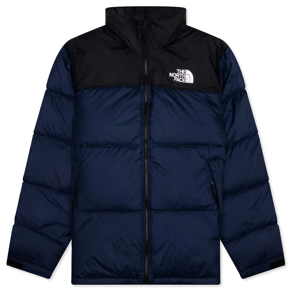 The 1996 Retro Nuptse Jacket in 'Summit Navy/Black' from The North Face features a relaxed, hip-length fit with an adjustable hem shock cord. Made from recycled materials, it offers down insulation for warmth, ripstop fabric for durability, and water repellency properties. Key details include a packable three-piece hood, secure-zip hand pockets, and the ability to stow the jacket in the right hand pocket. Adjustable cuffs with Triclimate® loops ensure compatibility with the GORE-TEX® Mountain Jacket. - 100% recycled body, lining and overlay fabrics - Relaxed fit, hip-length silhouette / Interior hem shock cord - 700-fill down insulation - Ripstop fabric with solid taffeta blocking for abrasion resistance - Non-PFC DWR finish for water repellency - Attached three-piece hood packs into collar - Adjustable elastic cuffs with Triclimate® loops - Style No: NF0A3C8DGOB1
