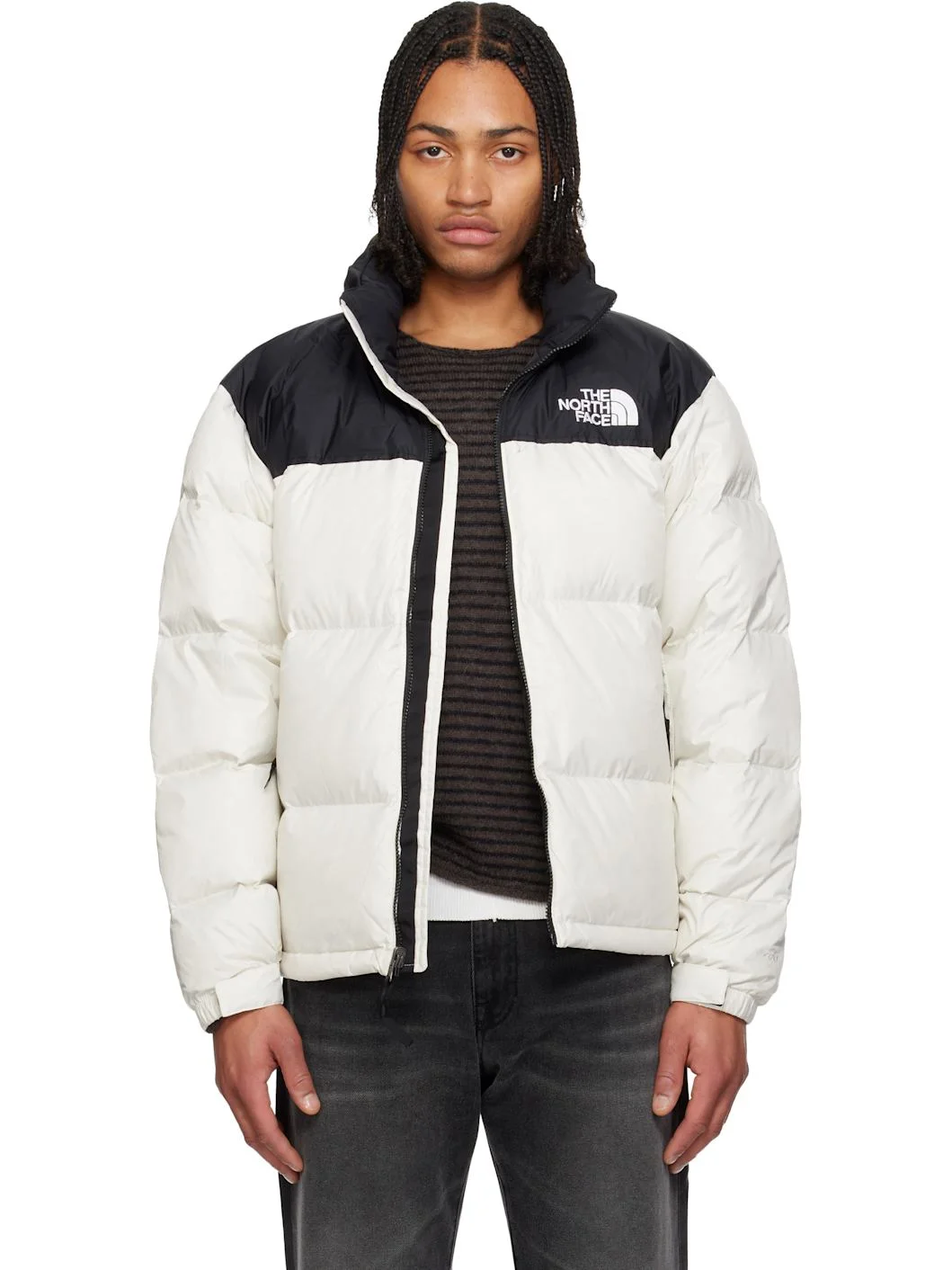 Packable down-filled and quilted recycled nylon ripstop jacket. · Water-repellent, non-PFC DWR coating · Recycled down · Stowaway hood at funnel neck · Bungee-style drawstring at hood · Zip closure · Logo embroidered at chest and back · Zip pockets at front · Concealed bungee-style drawstring at hem · Velcro tab at elasticized cuffs · Zip pocket at interior · Full taffeta lining Supplier color: White dune/TNF black/Recycled down Body: 100% nylon. Fill: 80% recycled down, 20% recycled waterfowl feathers. Lining: 100% nylon. Made in Bangladesh 252802M178023