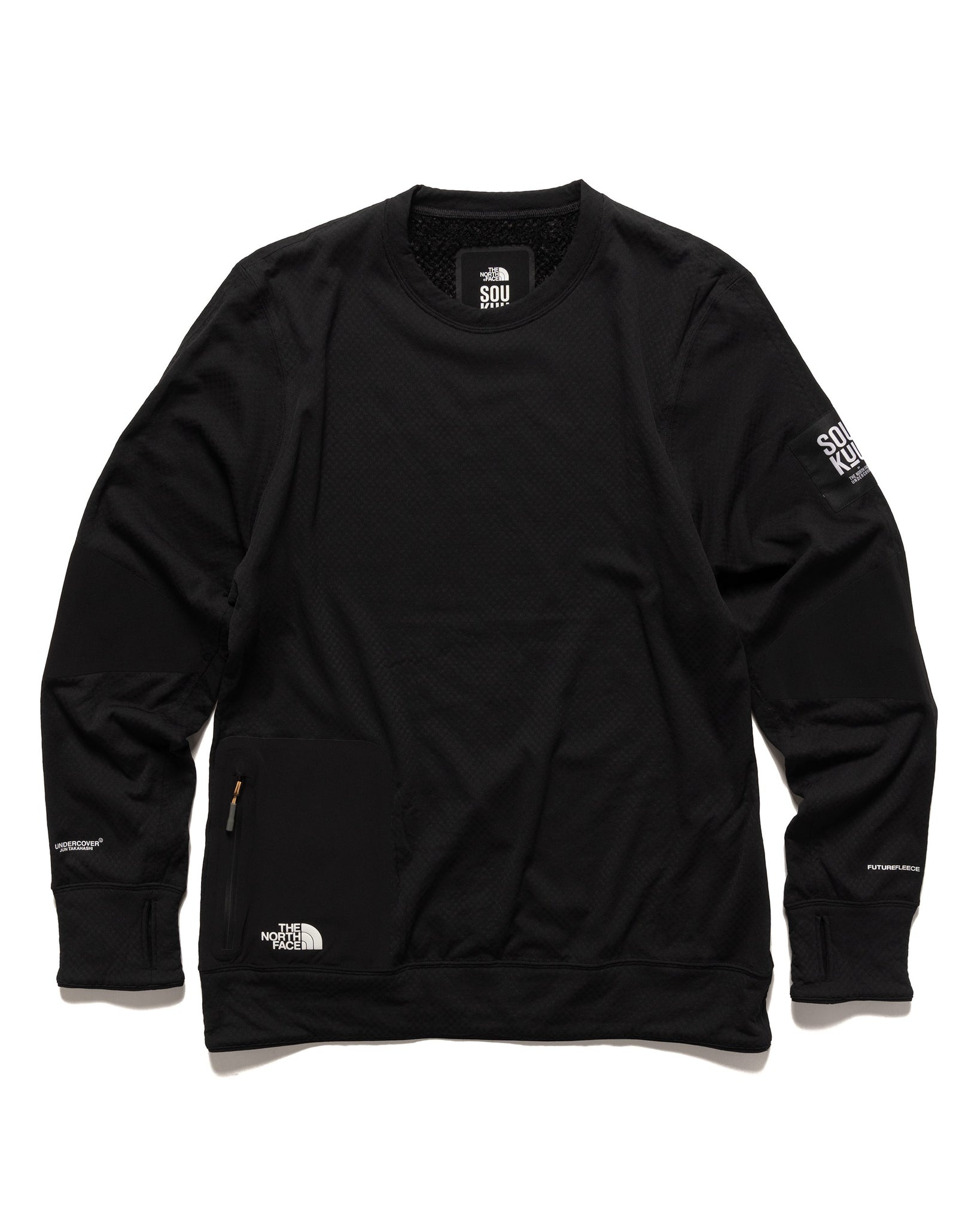 'SOUKUU' is the new collaborative effort between Undercover and The North Face, aimed at reinterpreting classic silhouettes to provide a fresh perspective on outdoor performance wear that blends effortlessly among urban and natural environments. A perfect midweight base layer top meant to fit closely next to skin for comfort and insulation utilizing highly breathable FUTUREFLEECE™ technology. The longsleeve is crafted with utility in mind, featuring a stow zip pocket at the right hip quarter and thumbhole details at the cuffs for protection against inclement weather. Articualted panels at the elbow provide an articulated fit. Finished with branding details throughout, the end result is a ultimately versatile and eye-catching garment blending key elements and aesthetics of both brands. DETAILS - A84S9 - Main: 100% Polyester, Contrast: 100% Nylon - Contrast nylon panelling - Zipper fastened stow pocket - Thumbhole cuffs - Made in Vietnam