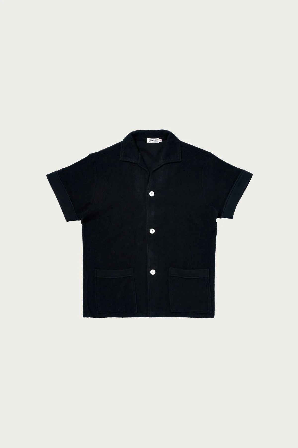 There’s something rich in texture about the Cotton Pile Beach Shirt that makes it feel like a piece already lived in. Woven from soft cotton pile, it calls back to mid-century resort style where shirts doubled as light covers after a dip in the sea. The open collar and shell buttons lend relaxed formality, while two lower patch pockets balance utility and ease. In black, it carries a quiet depth. Texture plays in shadow, letting the fabric speak quietly. Wear it open over a tee or buttoned as a stand-alone statement; either way it feels like you found something worth wearing in many summers to come. - 100% Cotton - Cotton Pile Fabric - Takase Shell Button - Made in Japan - Black