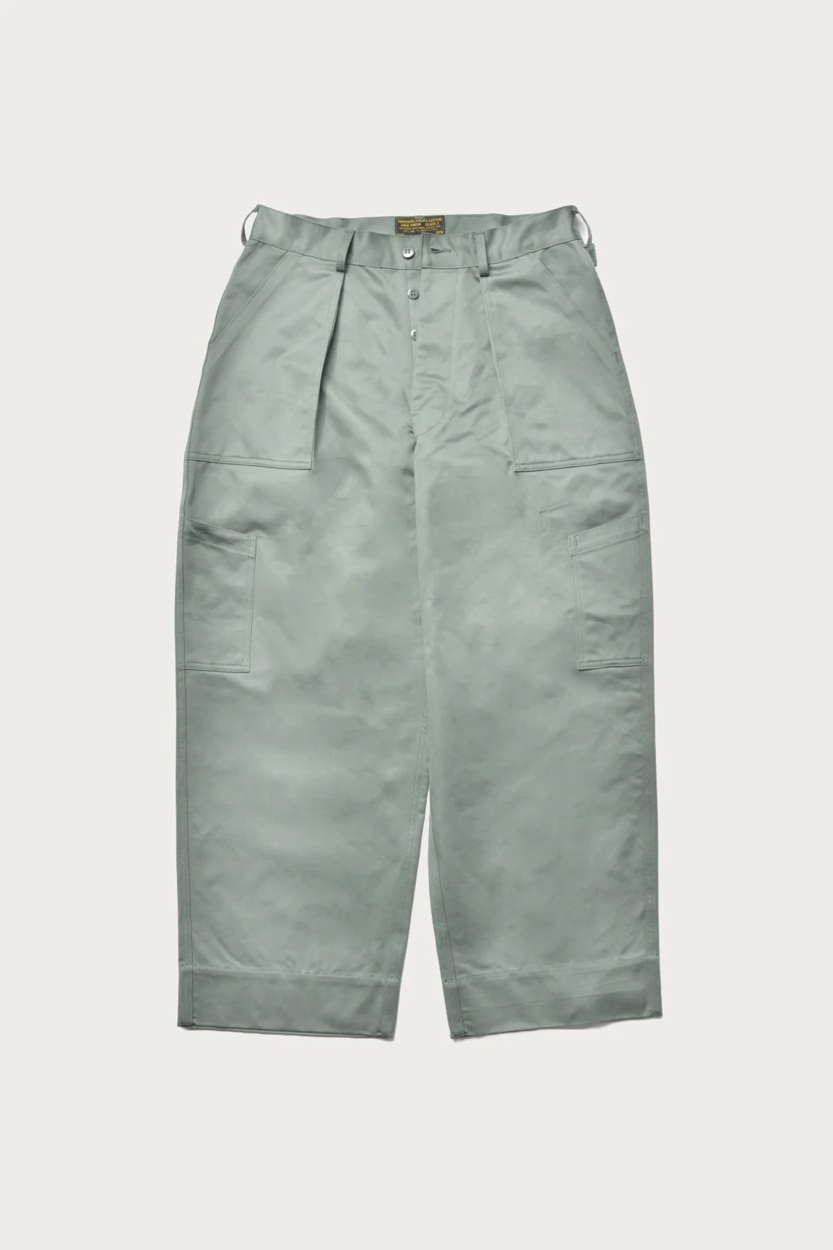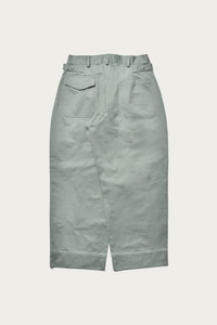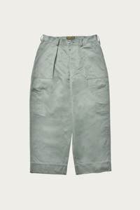 The U.S. Air Force crafted these pleated practical trousers with the needs of mechanics on the ground in mind. The sage green color, in sateen cloth, is true to the original spec and distinguishes ‘Grease Monkeys’ from personnel in fatigues. The TROUSERS, UTILITY, COTTON combine a high rise with a button front and distinctive patch pockets on the front, flanked by two slanted tool pockets. Additionally, there are two rectangular rear pockets, one of which is closed by a snap-buttoned flap. The distinctive long cinch-waist adjusting tabs are sewn into the rear darts and allow for a perfect fit, alongside the thin-cut belt loops. Meticulously reproduced from pieces in our archive with an accurately fuller cut for a wider silhouette. - Cotton Sateen Cloth - Urea Button - Cotton Sewing Thread Construction - Made in Japan