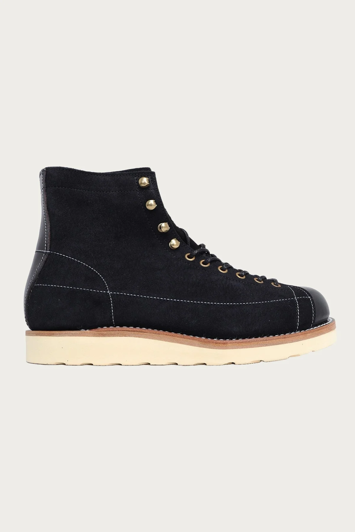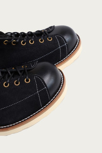 The TEN MILE WORK BOOTS / ROUGH OUT LEATHER are 60s style work boot that was affectionately known as a “Monkey boot”. The origins of monkey boots are likely intertwined with pre-war boot manufacturers in Czechoslovakia, where military boot production ceased during the country's invasion. Post-war, any remaining stock quickly found its way to Army surplus stores across Europe, swiftly gaining popularity among the British youth. The monkey boot is most commonly associated with the mod subculture, a movement which emerged in London during the late 1950s, gaining momentum in the early to mid-1960s. Characterised by a distinctive sense of style and a fervent embrace of modernity, the monkey boot, initially designed for utilitarian purposes, seamlessly resonated with the working-class roots of the mod movement. Simultaneously, its sharp and minimalist aesthetic also appealed to the tailored suits synonymous with mod culture. Boot manufacturers of the United States adopted this design in the 1950s and introduced a variation known as "roofer" style work boots. Inspired by the practical and durable features of the original monkey boots, these American adaptations were crafted for a secure fit on the foot and built with a gripping sole, qualities that were crucial in such hazardous lines of work. The TEN MILE WORK BOOTS / ROUGH OUT LEATHER draws on these elements, using a copper boot shank, the boots cut a balanced and striking silhouette. Ensuring a secure lace up, brass hooks and eyelets are used throughout. - Leather: rough-out - Brass Hooks and Eyelets - Copper Boot Shank - Made in Japan