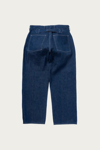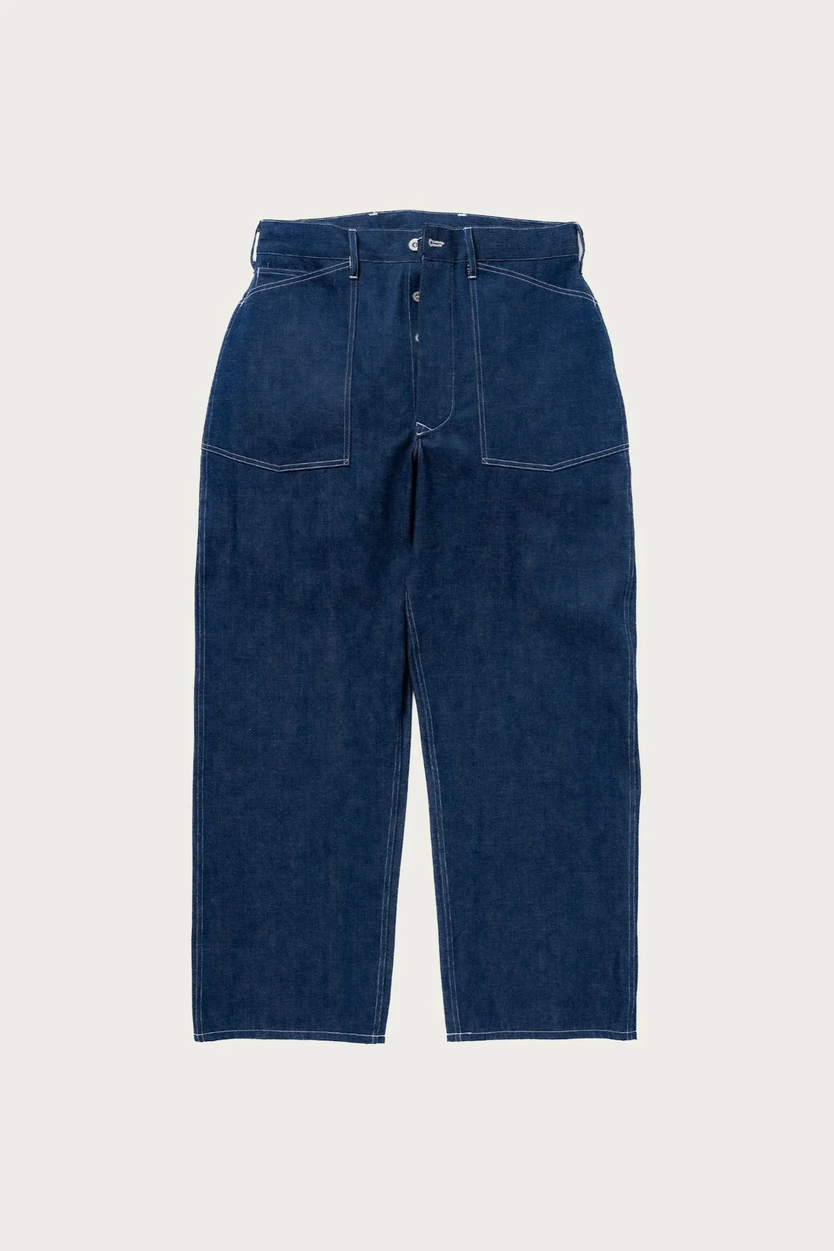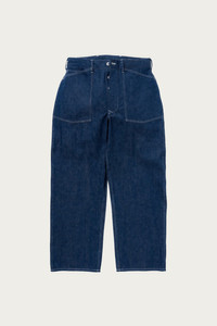 The Real McCoy’s Working Denim Trousers in Indigo bring together military heritage and Japanese craftsmanship in one rugged yet refined piece. Modeled after the U.S. Army’s 1919-adopted blue denim fatigue trousers, these are built with nearly identical patterning, including the rear cinch back, that was standard until 1937. The fabric is a lightweight 10-oz denim woven with an unbleached weft for crisp indigo depth and vintage character from day one. Design details like large front patch pockets (plus a coin pocket), twin rear pockets, white contrasting stitching, and a button fly keep the workwear roots true. Made in Japan by expert artisans, every pair feels like it has a story already woven in. - 100% Cotton - 10 oz. Unbleached Color Weft Denim - Tinplate Buttons - Cotton Sewing Thread Construction - Made in Japan