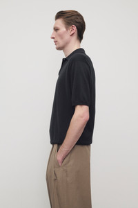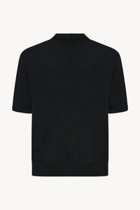 Short-sleeved polo top in lightweight melange cashmere with boxy fit, horn buttons, and ribbed collar, cuffs, and hem. Crafted from cashmere, linen, and silk, the breathable knit offers a tactile hand and relaxed, elegant feel. More information - 42% Cashmere, 36% Silk, 22% Linen - Made in Italy - Style: 1261Y876BLK