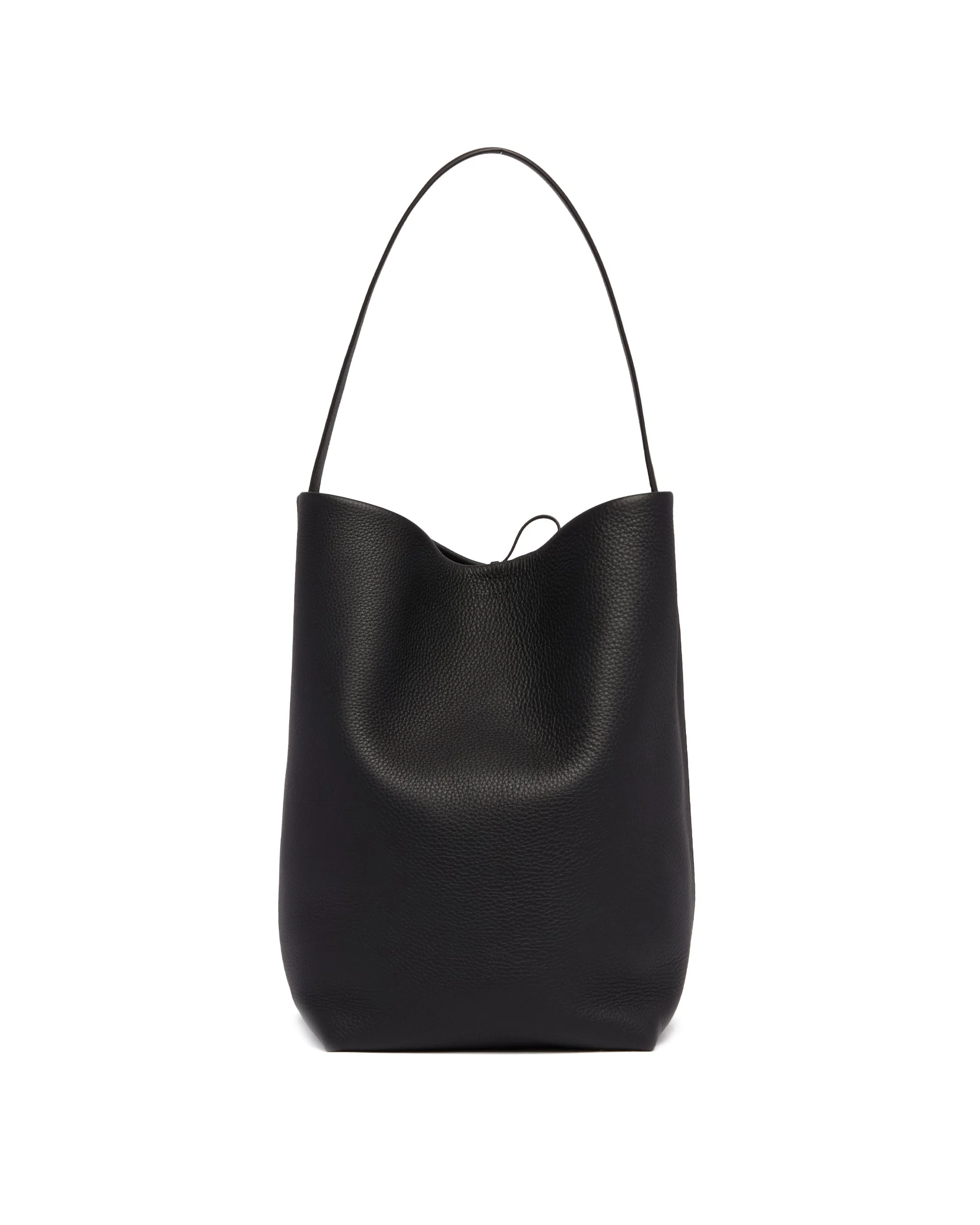The Row Black Large N/S Park Tote. Black leather, interior leather drawstring closure, flat tonal shoulder strap, fully lined interior, interior flat zip pocket. Size (cm): 43X37X20 DETAILS Model: W1273ML129BLK Composition: 100% Leather Made in: ITALY Season: FW25-26