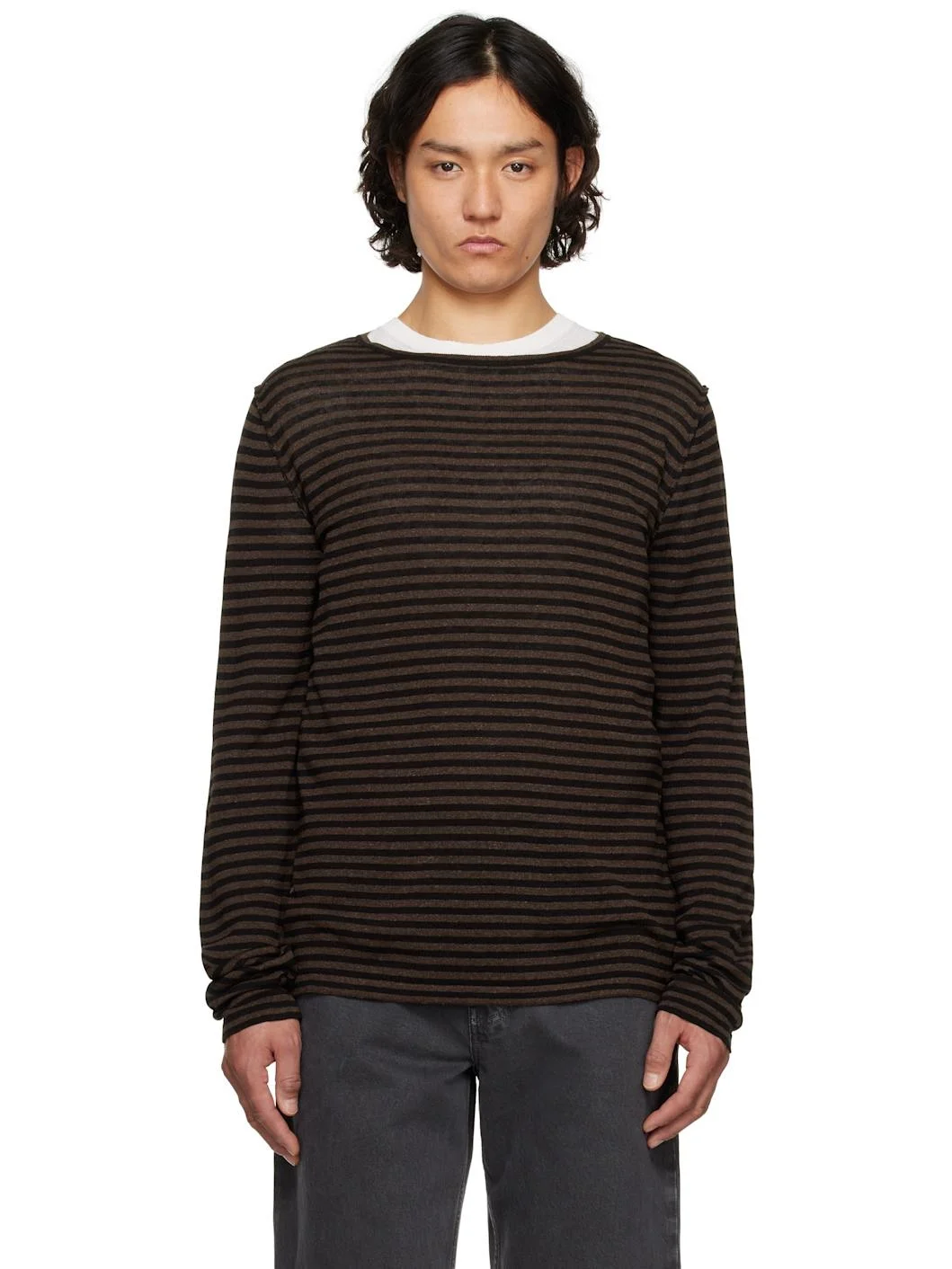 Knit linen- and cotton-blend sweater. Stripes throughout. - Rib-knit crewneck - Exposed seam at dropped shoulders Supplier color: Black/Brown stripe