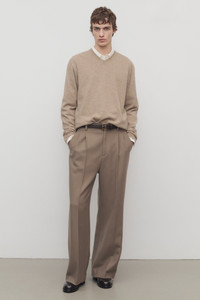Mid-rise tailored trouser in lightweight virgin wool and cashmere twill with wide leg, pressed front and back creases, and slanted side pockets. More information - 88% Wool, 12% Cashmere - Lined in 100% Cotton - Made in Italy - Style: 1115W4068BEG