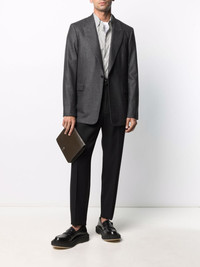 peak lapels single-breasted blazer grey wool-cashmere blend peak lapels front button fastening long sleeves buttoned cuffs two front flap pockets Italian rear vents Imported Composition Outer: Wool 87%, Cashmere 8%, Polyamide 3%, Spandex/Elastane 2% Lining: Cupro 100% SIZE & FIT Model measurements Height 6 ft 1 in(1.85 m) Bust/Chest 37.79 in(96 cm) Hips 37.4 in(95 cm) Waist 30.7 in(78 cm) FittingInformation This piece fits true to size. We recommend you get your regular size Cut for a loose fit Made with a mid-weight non-stretch fabric