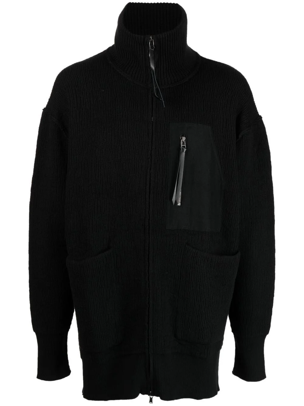 long-sleeve knitted cardigan black cotton-cashmere blend knitted construction stand-up collar front zip fastening two front patch pockets zip-fastening chest pocket long sleeves straight hem Imported Composition Cotton 95%, Cashmere 5% Washing instructions Hand Wash
