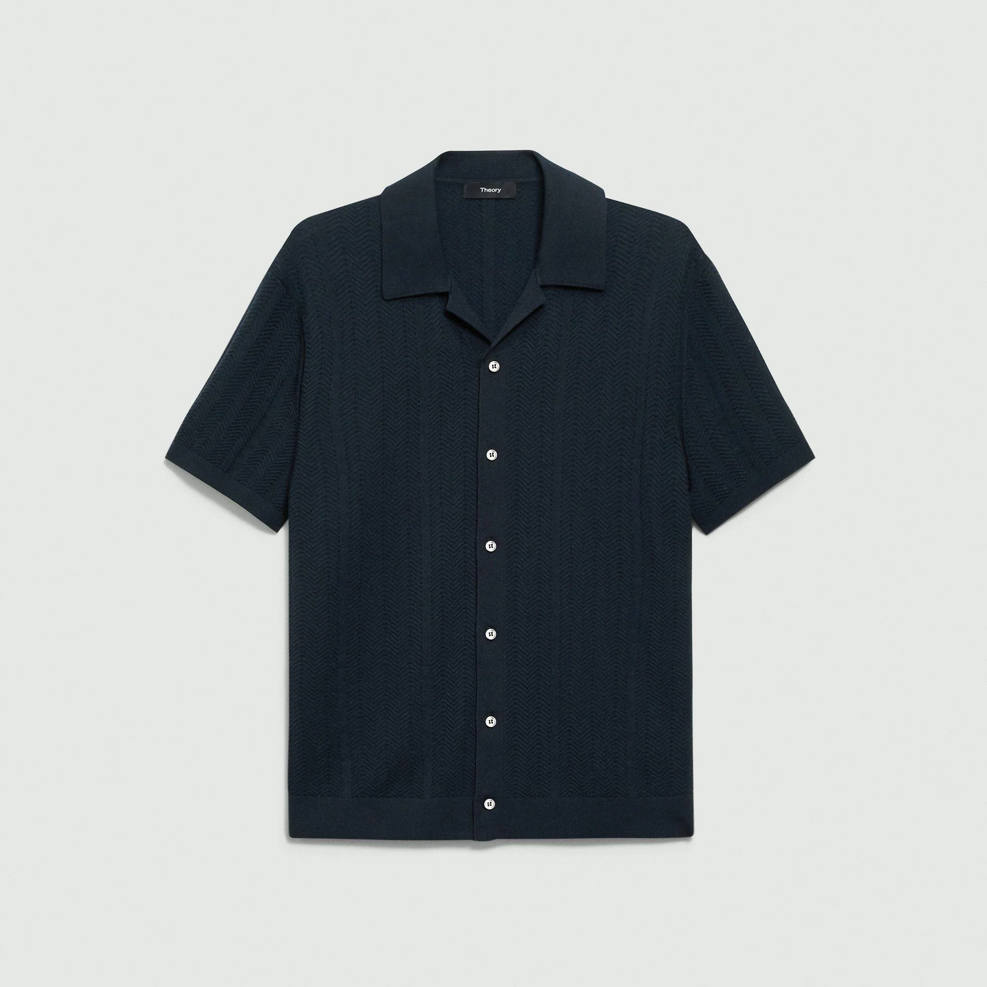 Please enter your email below to be notified when this item is in stock Detailed with a camp collar and subtle chevron detailing, this elevated take on the classic button-up is crafted in a high-twist cotton blended with nylon. This versatile style can be worn open with a tee or fully buttoned solo. Style #: P0584708 Please enter your email below to be notified when this item is in stock Fit True to size, choose your normal size Standard fit, short sleeves Regular length Model is 6’2”, chest 38” and wearing a US size M Discover the best fit for you on our. Materials & Care Composition 68% cotton 32% polyester; exclusive of elastic Care Hand wash cold. Do not bleach. Lay flat to dry in shade, do not tumble dry. Cool iron if needed. Dry clean with any solvent except trichloroethylene. Imported