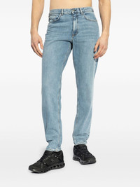 logo-patch jeans Highlights - Powder blue - Front button fastening - Classic five pockets - Belt loops Imported Composition Cotton 98%, Elastane 2% SIZE & FIT FittingInformation Designed for a tapered leg, these jeans allow a loose unrestricted fit over the leg with a closer fit towards the ankle Constructed from stretch denim, this piece offers a stretch fit with durability