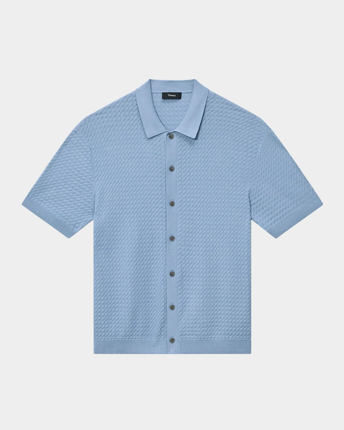 - Theory "Cairn" shirt in a waffle knit - Approx. 26.5"L from shoulders to hem - Spread collar - Button placket - Short sleeves - Regular fit - Cotton - Hand wash or dry clean - Imported