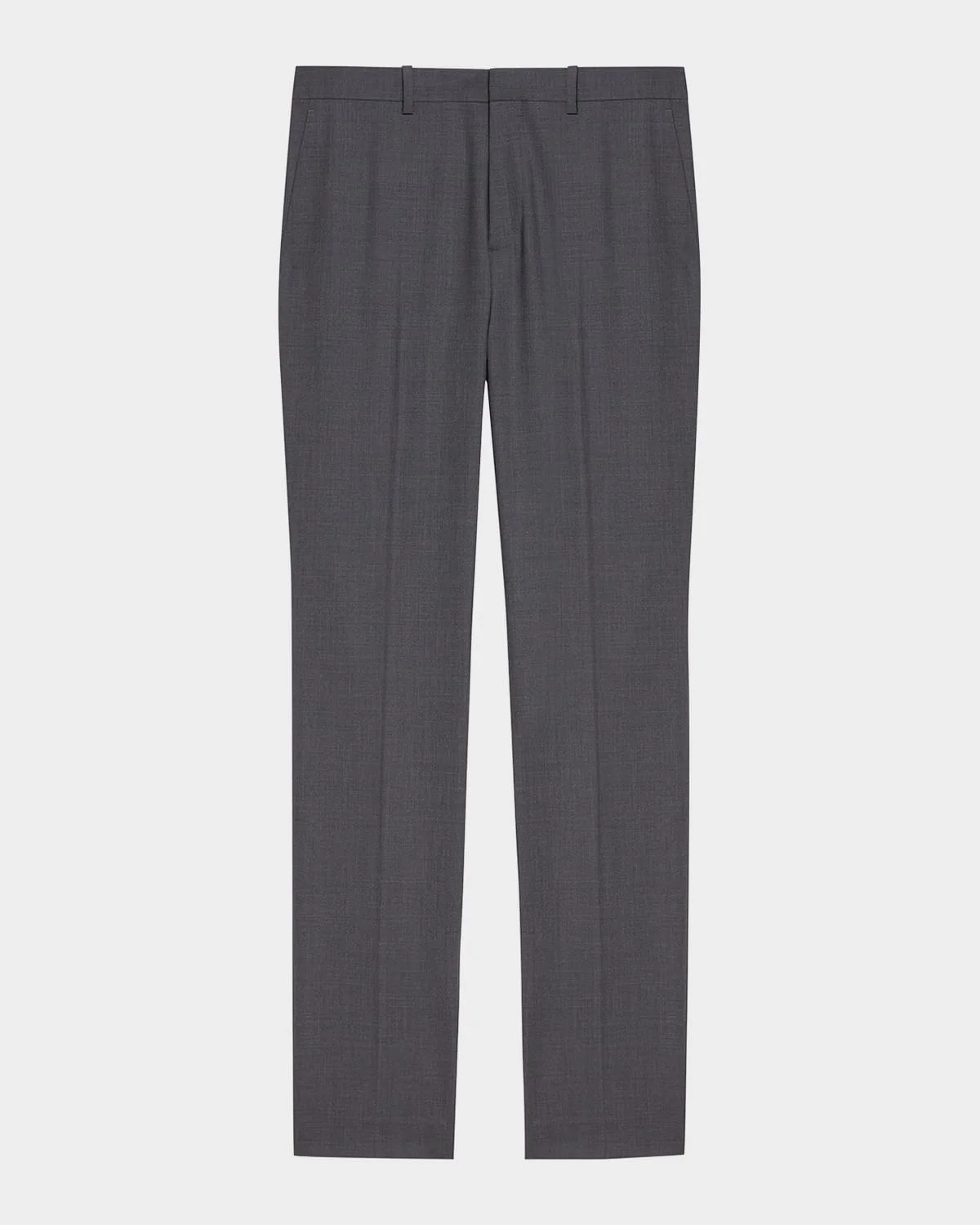 - Theory "Mayer" pants in solid stretch-wool. - Approx. measurements: - 11" rise; 34" inseam; 14" leg opening. - Side slash pockets; back welt pockets. - Straight legs; slightly tapered. - Hook-and-bar; zip fly; belt loops. - Virgin wool/Lycra/spandex. - Care note: - Do not wash, bleach, or tumble dry. Dry clean with any solvent except trichloroethylene - Imported. - Fashioned for change: responsible manufacturing. Find out more - here