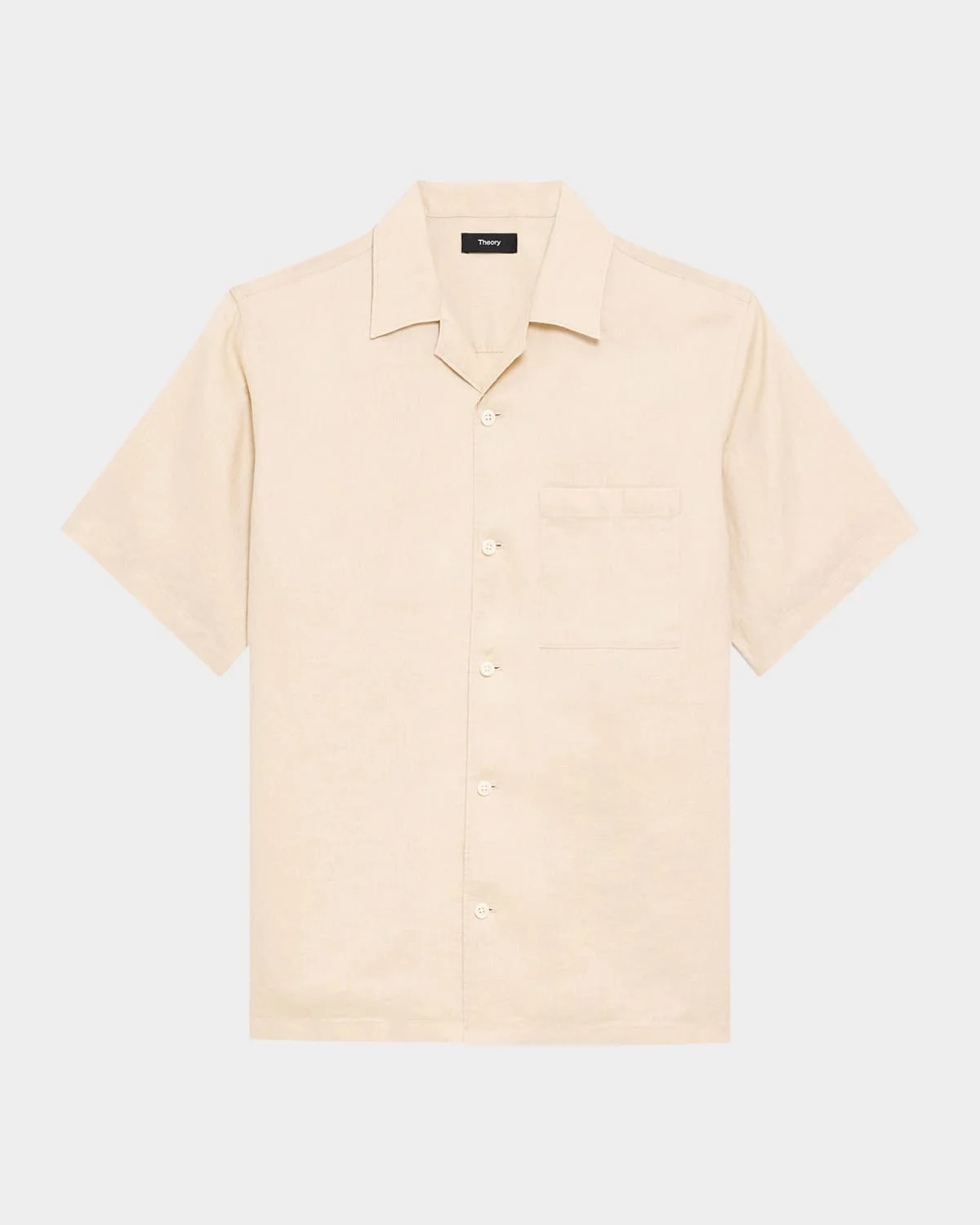 - Theory "Noll" sport shirt cut from lightweight linen - Camp collar; button front - Patch pocket - Short sleeves - Yoked back shoulders - Straight hem - Dry clean - Imported - Fashioned for change: responsible manufacturing. Find out more - here