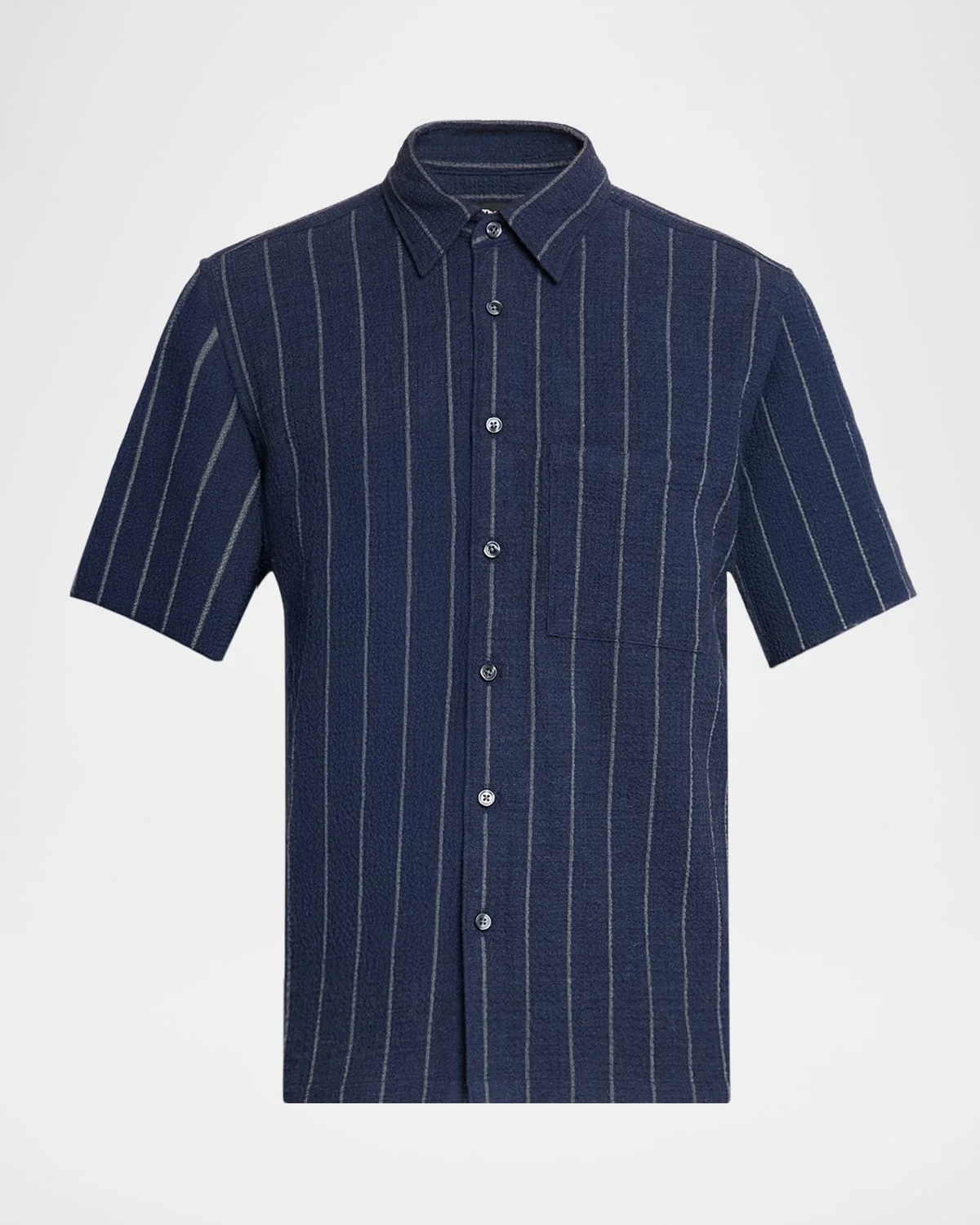 - Theory "Noll" shirt in a textured knit with a striped intarsia - Point collar; button front - Short sleeves - Chest patch pocket - Regular fit - Cotton/cashmere/elastane - Machine wash warm dry flat - Imported